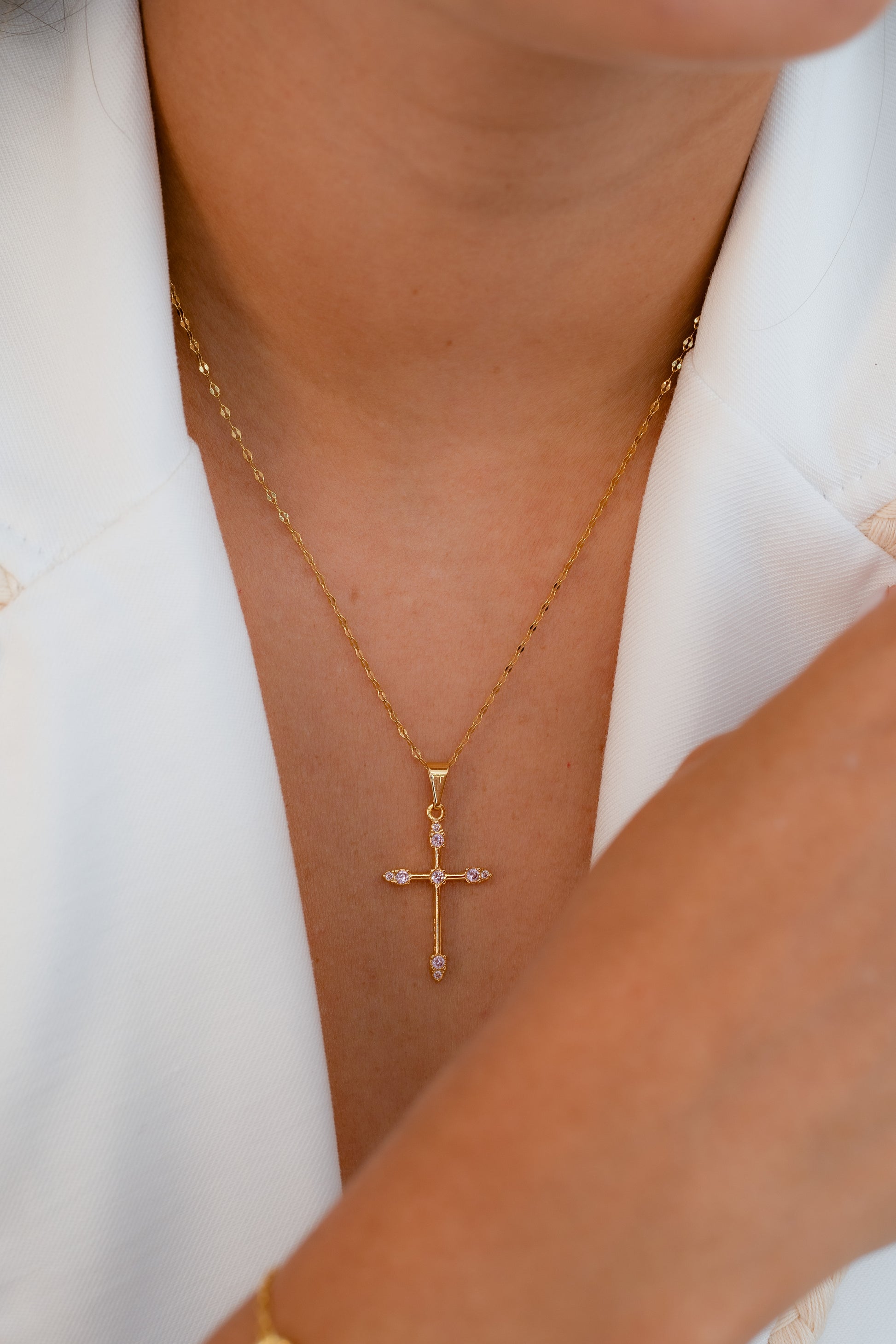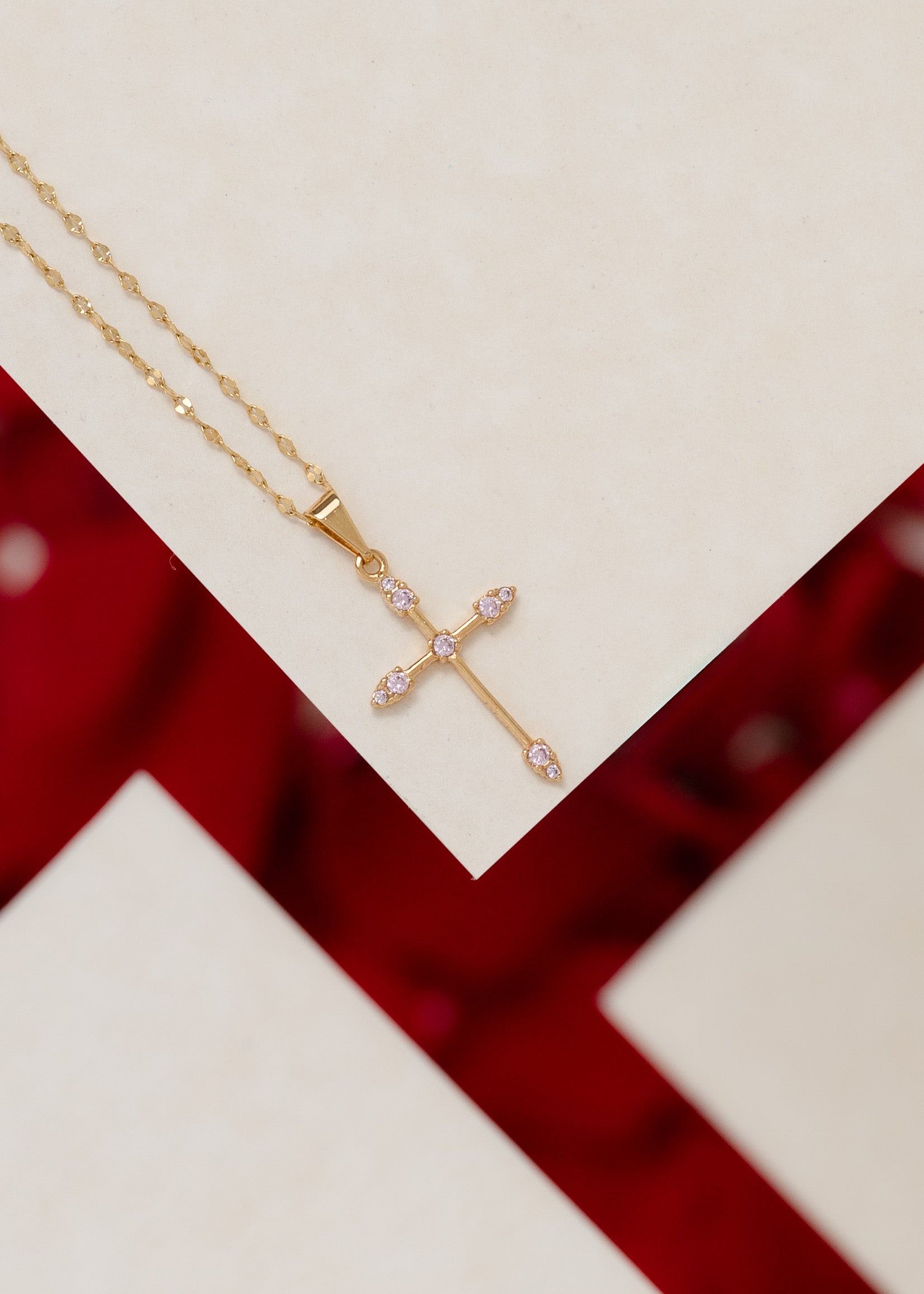 Cadena Espejo mediana (45cms) + Dije Cruz Tubular 9 circonias rosado